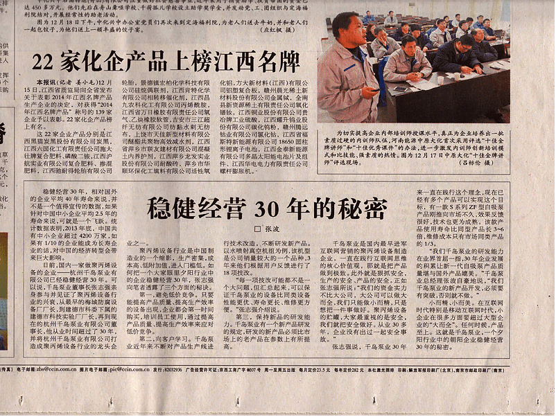 “杭州千島泵業(yè)有限公司”位于浙江省杭州市建德市新安江有機(jī)硅工業(yè)區(qū)118號(hào),是國(guó)內(nèi)較早的聚丙烯設(shè)備生產(chǎn)企業(yè)之一,擁有專利技術(shù)8項(xiàng),注冊(cè)資金1000萬,公司占地面積20畝。*需要說明的是,公司已經(jīng)在行業(yè)內(nèi)有35年歷史了,對(duì)于百年企業(yè)來講雖然不值一提,但是在工業(yè)設(shè)備生產(chǎn)企業(yè),還算比較牛吧。